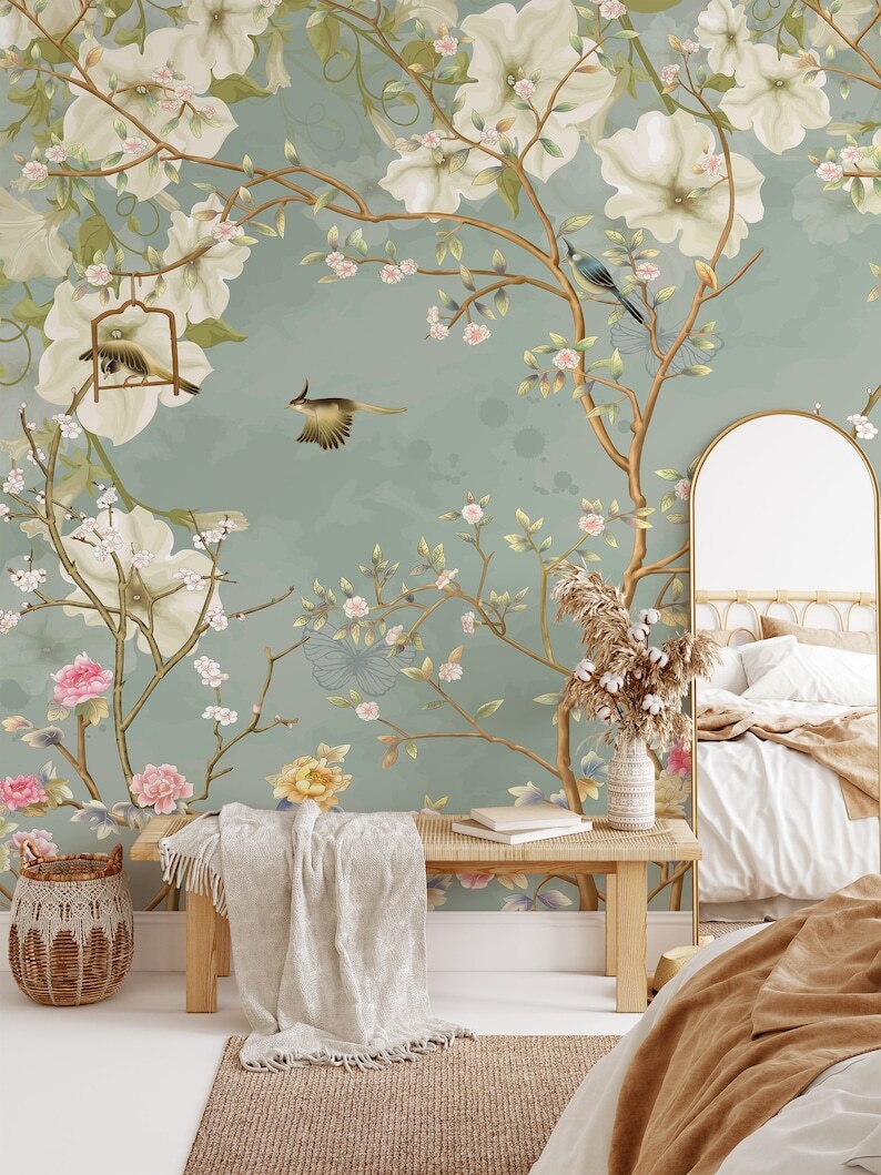 Chinoiserie Magnolia Wallpaper | Removable Peel & Stick Wallpaper | White Flowers Chinoiserie Wallpaper